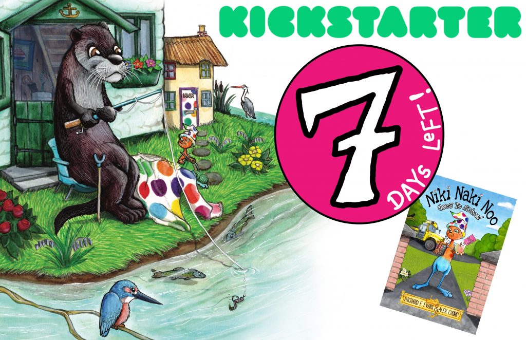 Just a week to go until Niki Naki Noo’s crowdfunding ‘Kickstarter’ closes. If we don’t reach our goal, we won’t be able to publish, it’s all getting a little nervy here! To relieve and tension Niki Naki Noo’s gone fishing for the day with his giant otter friend.